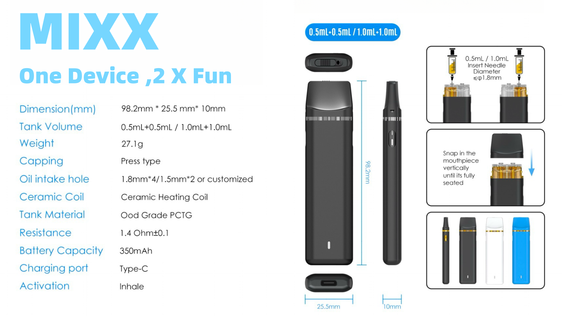 Get ready for double the flavor and double the fun with the MIXX dual-tank cannabis vape device.